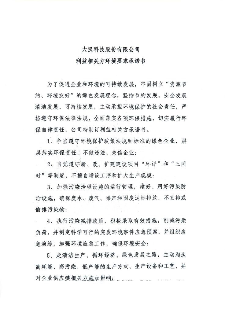 大漢科技股份有限公司利益相關(guān)方環(huán)境要求承諾書