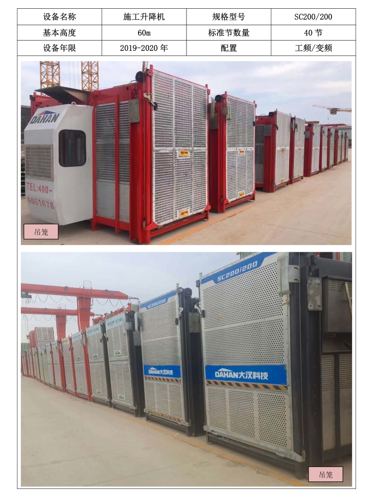 大漢科技股份有限公司發(fā)布二手施工升降機銷售咨詢信息。拍攝圖片所展示的設(shè)備為二手施工升降機產(chǎn)品,出廠日期為2019-2020年之間,含變頻、非變頻兩種型號,所有銷售設(shè)備均手續(xù)齊全、檢修保養(yǎng)完畢,以上圖片皆為實景實拍,隨時歡迎有需要的客戶咨詢考察!二手設(shè)備再利用,為您創(chuàng)造新價值!